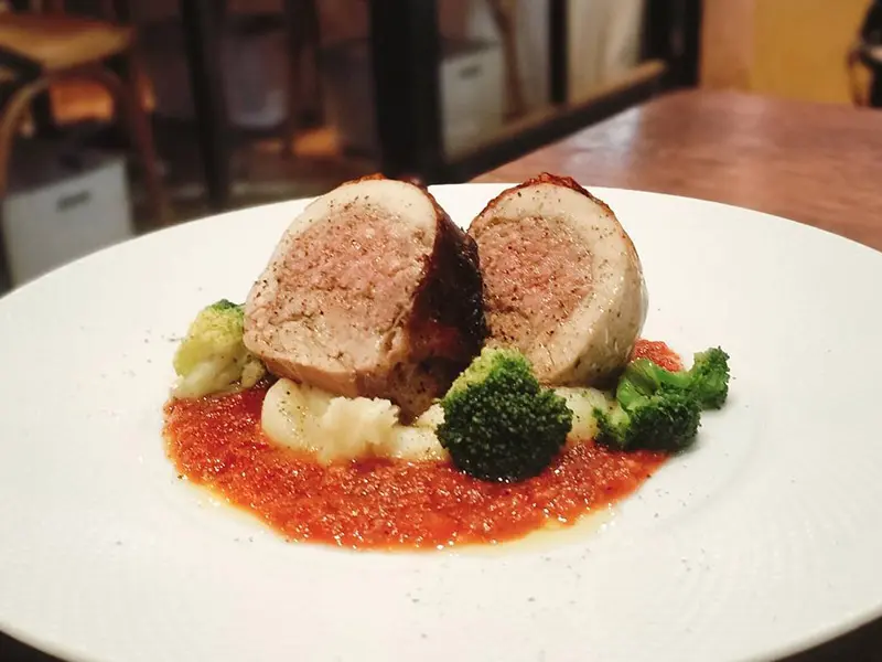 宮崎県産猪肉を巻いた若鶏のインボルティーニのロースト ~香草トマトソース~